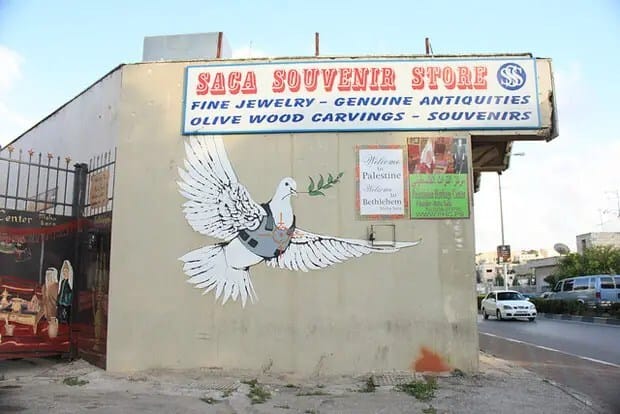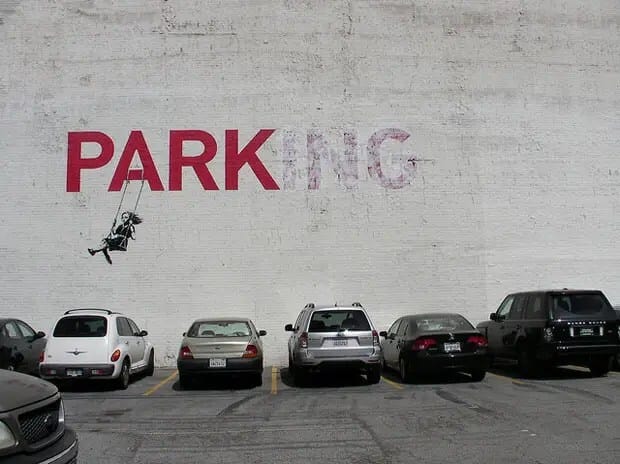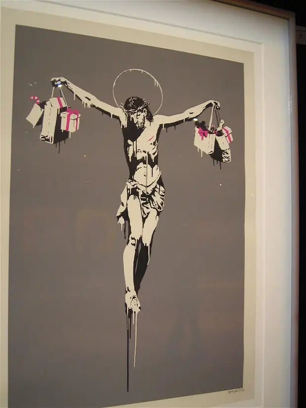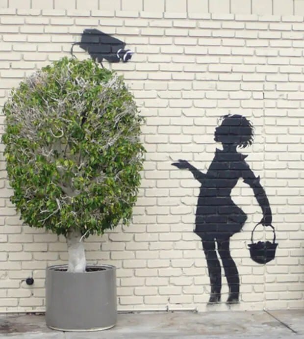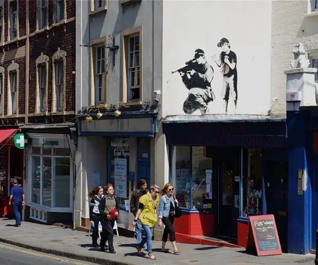 Banksy es un artista del graffiti que vive en Inglaterra. Es además activista político, director de cine y pintor. Su arte callejero combina el humor negro irreverente con una técnica especial de graffiti hecho en base a stenciles. Sus obras artísticas de comentarios políticos y sociales se han repartido en las calles, paredes y puentes de ciudades de todo el mundo. La mayoría de la gente dice que el graffiti es feo, perturbador, sin sentido, irresponsable e infantil. Todas estas alegaciones se puden tirar por el inodoro cuando se hace correctamente.