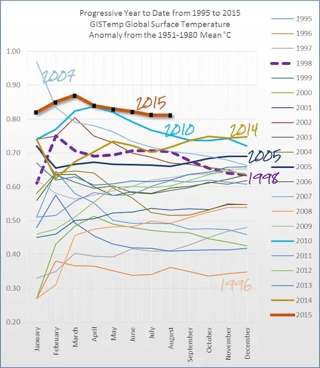 Como muestra el gráfico, el 2015 ha marcado un ritmo muy superior al de los años anteriores. Con toda probabilidad, el calentamiento global se incrementará en 2015 con el correr de los meses, debido al aumento de temperaturas en el pacifico centro-este, asociados al fenómeno de El Niño, lo cual significa que el 2016 seguramente superará al 2015.