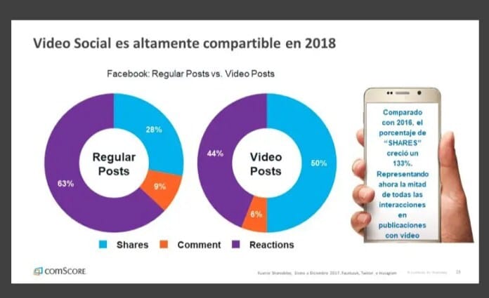 Comparado con 2016, el porcentaje de «Shares» creción un 133%, representando ahora la mitad de todas las interacciones en publicaciones con video.