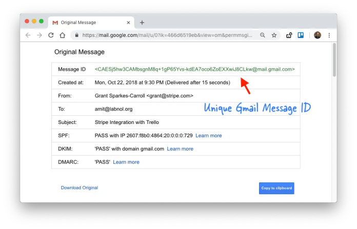 Cuando enviás un correo a través de Gmail, se agrega un ID de mensaje único al encabezado del correo según la especificación RFC 822. Para conocer el ID de tu mensaje, abrí el email dentro de Gmail, andá al menú de 3 puntos y elegí Mostrar original. El ID de mensaje se mostrará en la primera línea del encabezado, como se muestra en la siguiente imagen: