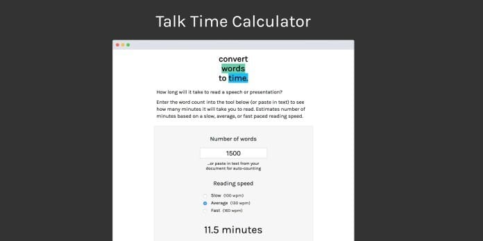 Words to Time calcula la cantidad de minutos en función de una velocidad de lectura lenta, media o rápida.