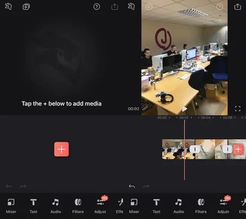 Su uso es muy sencillo, para comenzar, tocá el signo + en el centro de la pantalla para agregar contenidos de tu teléfono a la aplicación. Seleccioná tantas fotos y videos como necesites para tu proyecto.