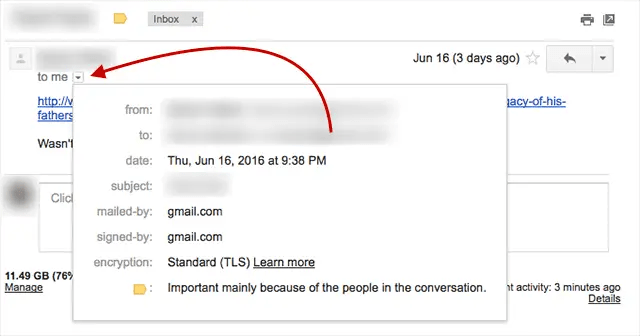 También puede echarse un vistazo más de cerca a los mensajes electrónicos recibidos que no están clasificados automáticamente como autenticados. En Gmail, abrir el mensaje y hacer clic en la flecha pequeña justo debajo de la dirección de correo electrónico del remitente. Chequear el campo «enviado por» o «firmado por» para asegurarse de que viene del dominio asociado con el remitente.