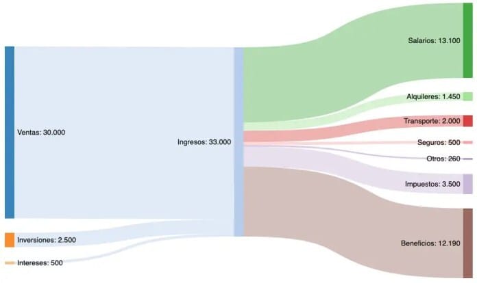 Un diagrama de Sankey representa flujos de cualquier tipo. Es un tipo de gráfico en el que los datos recorren flujos lógicos, y el grosor del trazo es proporcional a su tamaño.