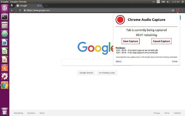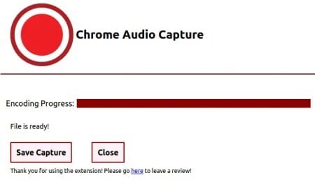 La extensión captura el audio en la o las pestañas actuales, y guarda el archivo de salida en tu dispositivo cuando se completa la captura.