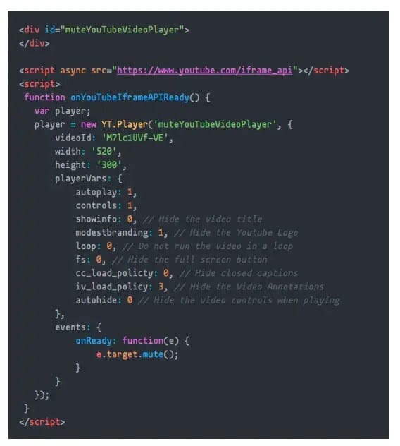 Además, puede personalizarse el reproductor mediante la modificación de las diversas variables como se ha comentado en el código. Por ejemplo, si se establece el loop como 1, el video se reproducirá en un loop. Setear fs como 1 para mostrar el botón de pantalla completa en el interior del reproductor de video. Internamente, el reproductor incorpora el uso de la IFRAME API de YouTube. Cuando se carga la página, el evento se ejecuta onReady, que silencia el video.