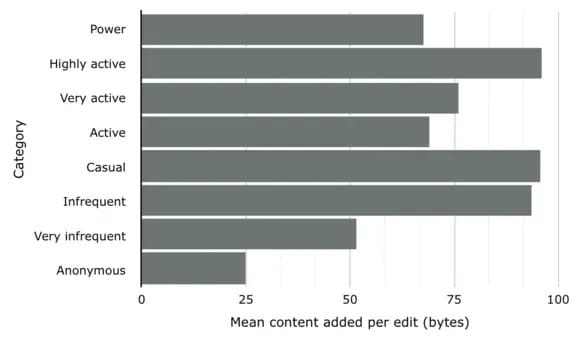 Analizando la información puede inferirse que los usuarios altamente activos son los responsables de la mayor parte de contenido agregado en el artículo (casi la mitad del total). Sin embargo, el resto de las categorías tienen diferencias muy pequeñas, esto sugiere que la edición de los artículos no es sólo fruto de la tarea de los usuarios altamente activos, sino que existe un amplio rango de estilos de edición y experiencia.