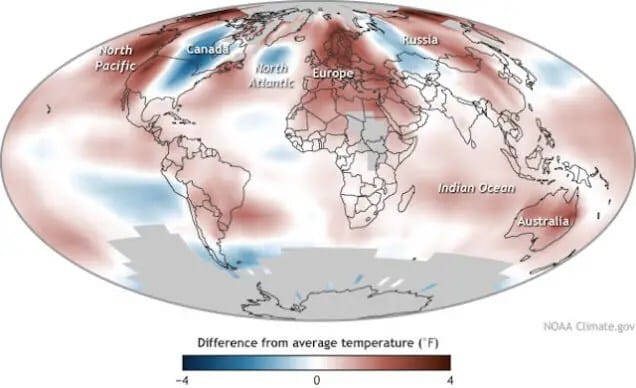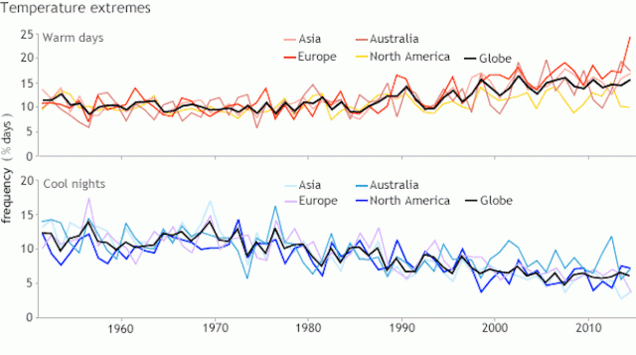 Cuando se muestra la data recogida desde 1961 la tendencia se vuelve muy clara: estamos experimentando una excepcional alta frecuencia de días más cálidos que el promedio de días del año anterior, y los únicos lugares que tuvieron temperaturas más frías extremas fueron el este de los Estados Unidos y parte de Canadá.