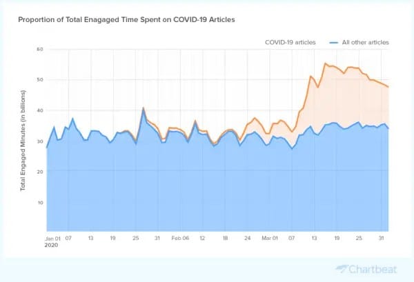 El análisis más reciente de Chartbeat de los datos de lectores de coronavirus sugiere que a pesar del flujo continuo de tráfico, y la cobertura de los proveedores de noticias, estamos viendo el inicio de la fatiga del lector. Si bien la cobertura del virus y la pandemia global asociada aún brinda a los lectores información vital, los equipos de contenido deberían comenzar a monitorear de cerca sus propias métricas para considerar la asignación de recursos a otros tipos de cobertura, y evitar la saturación.
