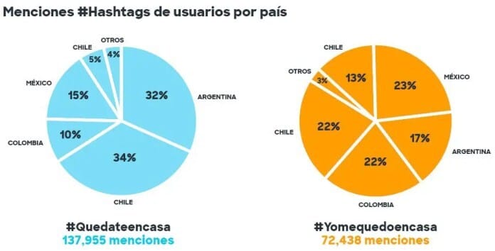 En cuanto a los hashtags más usados #YoMeQuedoEnCasa obtuvo un total de 72.438 menciones (de las cuales Argentina tuvo el 32%), y #QuedateenCasa más de 137 mil menciones en la región (Argentina tuvo el 17%).