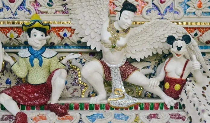Mientras caminas por el Templo de Pariwat, tal vez no notes la estatua de una criatura con forma de conejo que sostiene un teléfono en un palo de selfie, o la de Mater Roshi de Dragon Ball Z, que puede confundirse con una legendaria figura budista.Incluso podrías ignorar la estatua amarilla de Pikachu con su cola en zigzag, pero no hay forma de ignorar las representaciones en mosaico de superhéroes modernos como Spider-Man, Batman o el Capitán América.