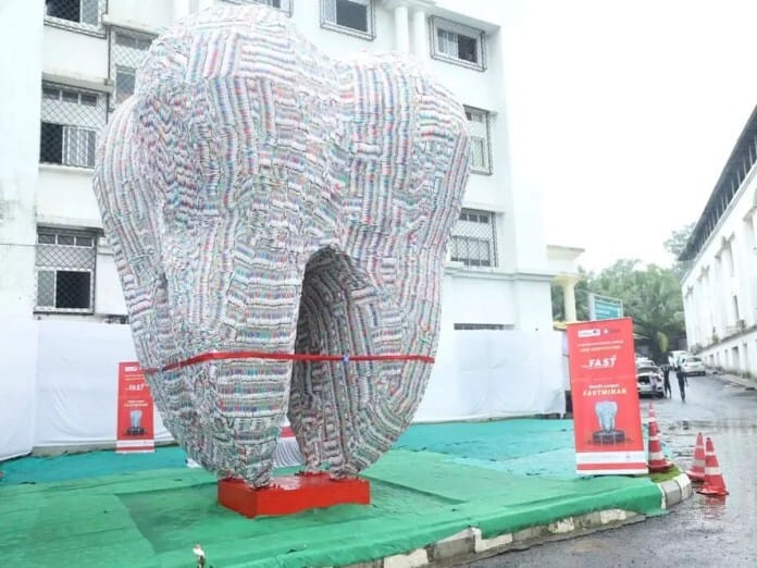 La compañía creó la escultura de 12 metros, apodada Fastminar, en el Terna Dental College en Navi Mumbai, India, y fue realizada con aproximadamente 80.000 cepillos de dientes.