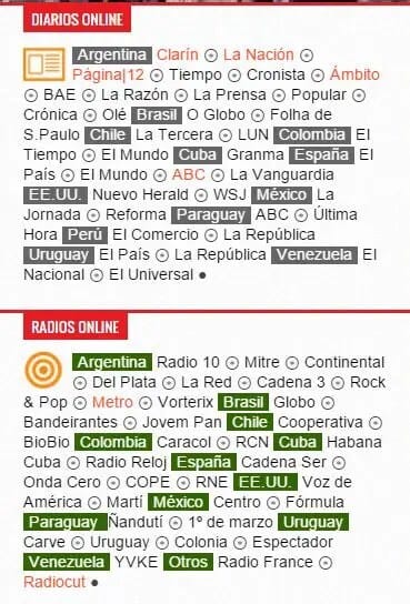 Desde esta sección puede accederse en forma gratuita a más de 150 medios de Latinoamérica, España y EEUU, con solo hacer clic sobre cada uno.