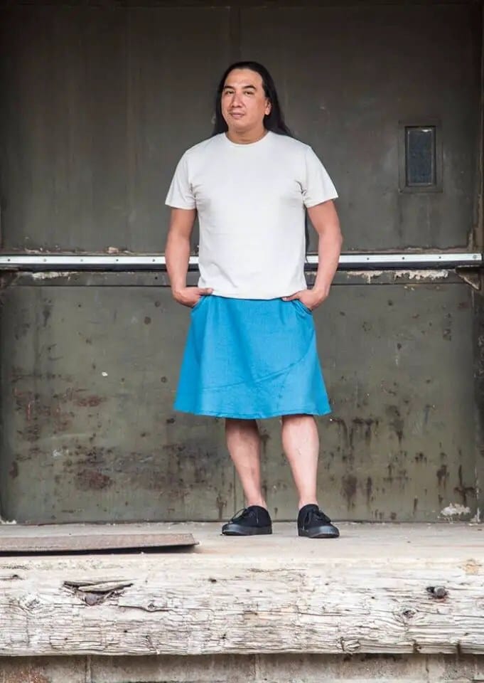Pero los estereotipos no iban a interponerse entre Joe y la cómoda sensación de llevar una falda. Después de buscar polleras unisex y no encontrar nada a su gusto, el hombre de Minnesota decidió hacer las suyas propias. Había estado aprendiendo a coser y tenía una idea bastante buena de lo que quería lograr. Más de 20 prototipos más tarde, se le ocurrió la Unaligned Skirt, una falda moderna pero robusta hecha de tela pesada y con bolsillos profundos y presillas para el cinturón.