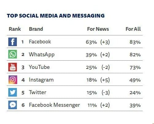 También hubo cambios en el consumo de noticias en las plataformas de redes sociales, que aumentaron en Facebook, WhatsApp, Instagram y Facebook Messenger, y disminuyó en Twitter y YouTube.