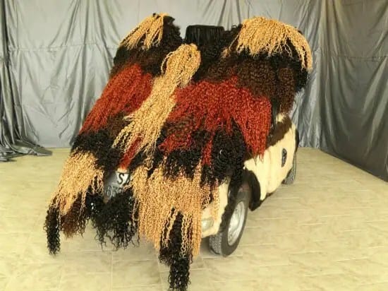 Además, vale mencionar que el vehículo no solo está recubierto por fuera, sino que sus asientos, tablero de control y volante también están trenzados. Y no sólo eso, sino que en la parte posterior del coche lleva una escultura de pelo con forma de mariposa «para representar la paz y la libertad mundial».