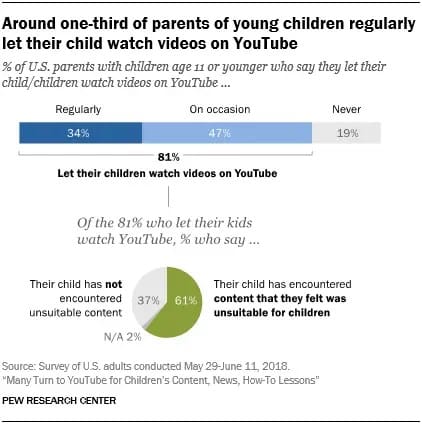 7 – Aproximadamente ocho de cada diez padres con niños de 11 años o menos (81%) dicen que al menos ocasionalmente dejan que sus hijos vean videos en YouTube, incluido el 34% que dicen que lo hacen regularmente, según la encuesta de 2018 . Entre los padres que dejaron que sus hijos pequeños vieran videos en YouTube, el 61% dijo haber encontrado contenido que consideraban inadecuado para los niños. La encuesta no interrogó a los padres sobre si permitían que sus hijos vieran YouTube o YouTube Kids estándar, que es un producto especial con mayores niveles de control y monitoreo parental.