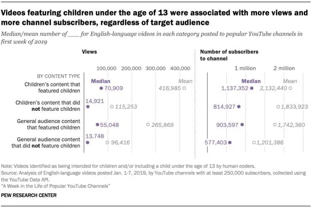 6 – El contenido infantil y los videos con niños también son muy populares. Si bien solo el 4% de todos los videos en inglés publicados por canales populares en la primera semana de 2019 estaban claramente dirigidos a niños menores de 13 años, estos videos recibieron más visitas que otros. Y los videos que presentaban a niños que parecían ser menores de 13 años, independientemente del público objetivo, atrajeron aún más engagement, con un promedio de más de tres veces más vistas que otros tipos de videos. Los videos con niños menores de 13 años se asociaron con más vistas y más suscriptores del canal, independientemente del público objetivo.