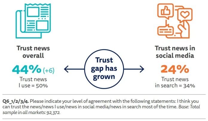 La confianza en las noticias ha crecido de media 6 puntos en este año de pandemia y se sitúa en un 44%. Esta subida es un cambio con respecto a los últimos años. Finlandia es el país con el nivel más alto de confianza (65%) y EEUU el país con el más bajo (29%).