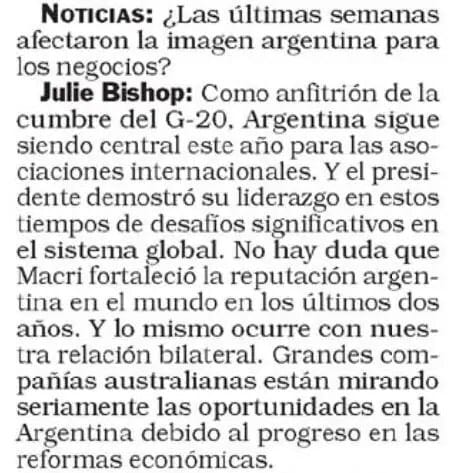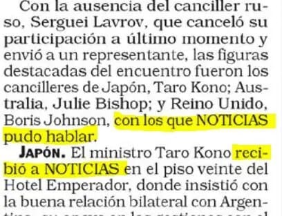 En el número del 24 de mayo pasado, la revista Noticias se jactaba de haber conseguido entrevistar a los cancilleres de Japón, Australia y Reino Unido con motivo de la reunión en Buenos Aires del G20.