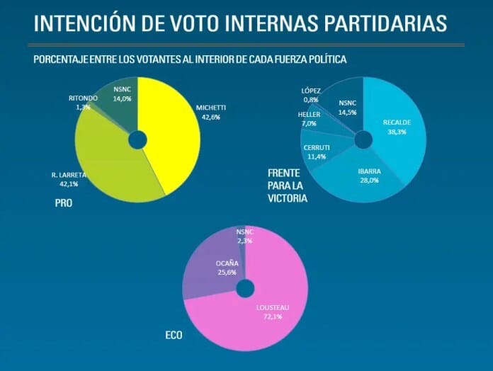 En cuanto a la elección de los precandidatos a Jefe de Gobierno en la Ciudad de Buenos Aires, los sondeos indican que en el PRO, Gabriela Michetti (42.6%) lidera la intención de voto por sobre el candidato de Macri, Horacio Rodríguez Larreta (42.1%). En el caso del FPV Mariano Recalde sería el dirigente con más aceptación dentro del kirchnerismo local con el 38.3%, seguido por Aníbal Ibarra con el 28.0%. En UNEN Martín Lousteu con el 72.1% lleva un amplio margen sobre Graciela Ocaña que tiene el 25.6% de intención de voto.