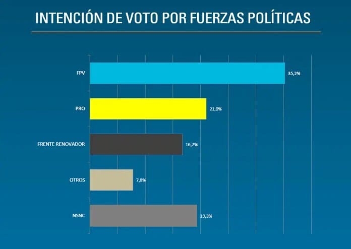 En la Provincia de Buenos Aires, la intención de voto por fuerza política ubica al FPV como primera fuerza, con el 35.2%, seguido por el PRO (21%) y el Frente Renovador (16.7%).
