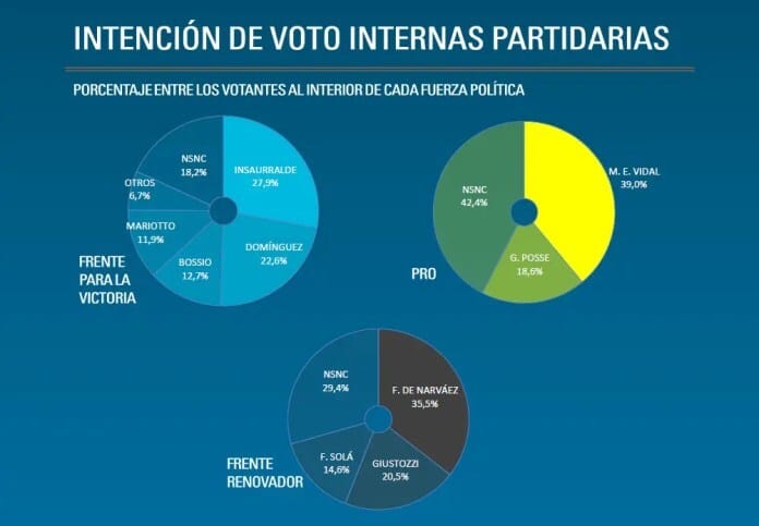 En cuanto a la elección de los precandidatos a Gobernador de la Provincia de Buenos Aires las encuestas muestran a Martín Insaurralde (27.9%) como el candidato con más posibilidades del kirchnerismo, seguido por Julián Domínguez (22.6%). En el PRO María Eugenia Vidal lidera la intención de voto con el 39.0%, seguida por Gustavo Posse con el 18.6%. El Frente Renovador tiene a Francisco De Narváez liderando las encuestas con el 35.5%, seguido por Darío Giustozzi con el 20.5%.