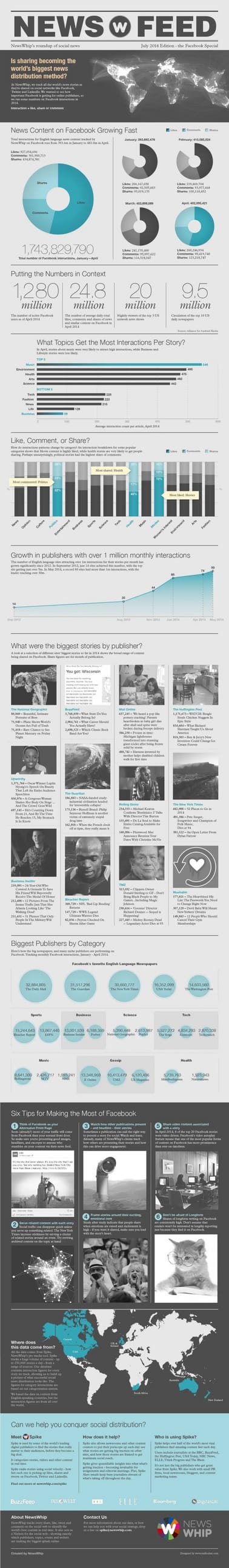 Las interacciones con contenido de noticias (compartir, darle «me gusta» o comentar) aumentaron en los últimos meses de 393 millones aproximadamente en enero, a 482 millones en abril. En total en los primeros cuatro meses del año, hubo un total de 927.054.696 «me gusta», 381.900.713 comentarios y 434.874.381 compartidos. El total de 1.743.829.790 interacciones cobra más relevancia en relación a los usuarios totales de Facebook, que eran hasta abril 1.280 millones, según registra Newswhip en una infografía.