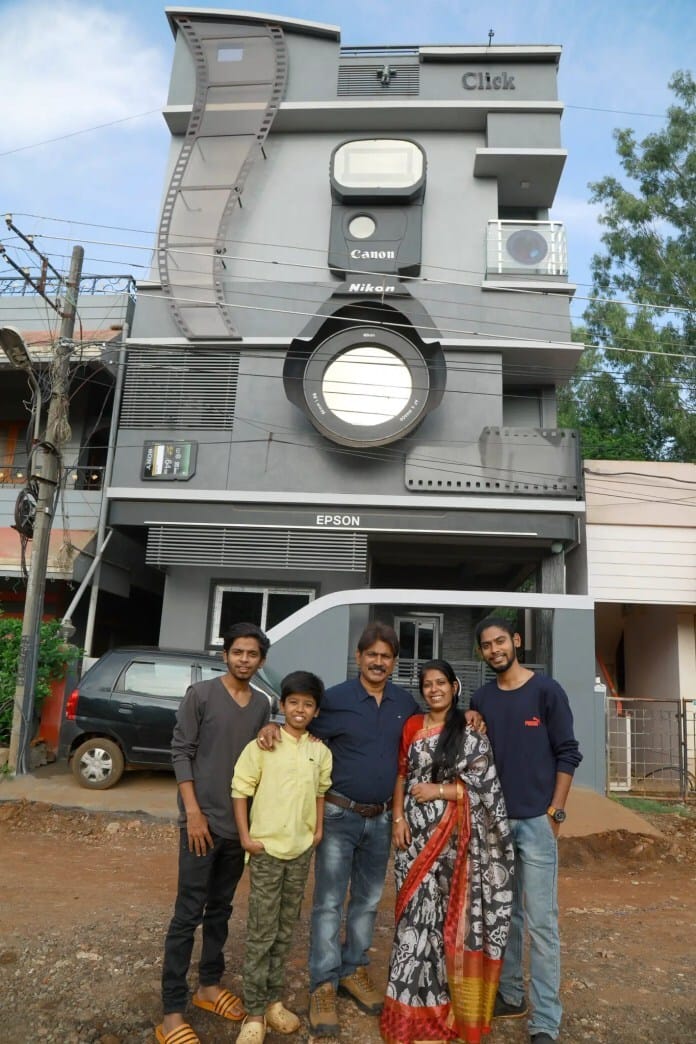 Pero como si la obsesión de Ravi con la fotografía no fuera ya obvia, decidió exhibirla por completo teniendo su casa de tres pisos diseñada como una cámara gris gigante con todo tipo de detalles como lente, flash de cámara gigante, Tarjeta SD, varios rollos de película, así como los nombres de sus hijos: Canon, Nikon y Epson.