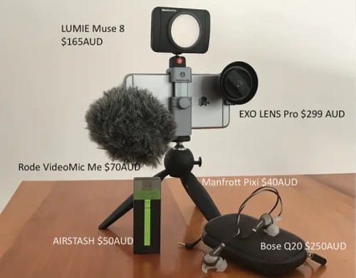 Mi kit básico incluye un Zeiss Exolens de gran angular que hace que el trabajo manual sea mucho más estable. También significa que puedo acercarme más a mi sujeto, lo que puede resultar en una grabación de sonido de mejor calidad. Agrego un trípode Manfrotto Pixi, un micrófono Rode Video Micro, Smart Lav + (A $ 60), la luz LUMIE Muse, una memoria USB Airstash transfer y un set de auriculares.