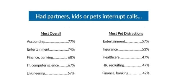 También se les consultó a los participantes si algún integrante de la casa interrumpía las videollamadas. Dos de cada tres personas (69 por ciento) han tenido una pareja, un hijo o una mascota que aparecieron inesperadamente en la pantalla durante una videollamada, siendo las mascotas los culpables más comunes (43 por ciento), seguidos por los niños (37 por ciento) y las parejas (34 por ciento).