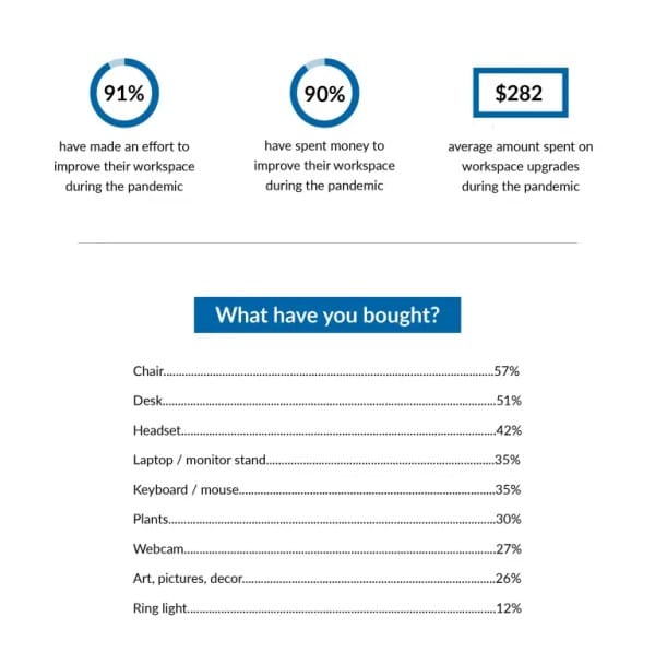 La encuesta encontró que el 90% de los encuestados invirtió algo de dinero en el trabajo remoto. Específicamente, el 57% de los encuestados compró una silla, y el 51% adquirió un escritorio nuevo. Además, el 58% de los encuestados respondió que “el empleador pagó los gastos y proporcionó equipos para mejorar el espacio de trabajo en el hogar”. La cantidad promedio de dinero gastada en actualizar el equipo usado en el trabajo fue de USD 282.