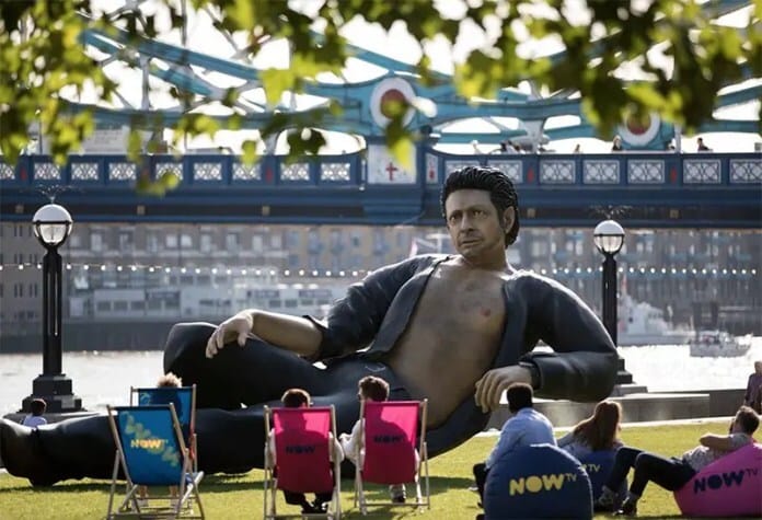 Quien está detrás del gigantesco Jeff Goldblum de 150 kilos es el servicio de streaming británico Now TV. El muñeco inflable mide 3 metros de altura, casi 7 metros de largo, y crearlo tomó 250 horas durante más de seis semanas, brindando a los londinenses el mejor punto panorámico para una selfie.