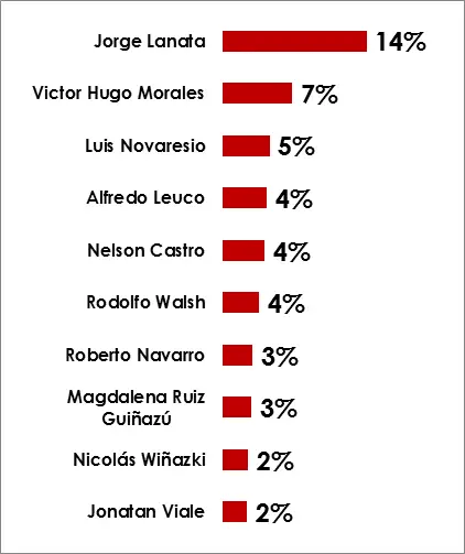 Los resultados arrojados por el informe de la consultora OH! Panel evidencian una vez más la división política existente en Argentina, con los primeros dos lugares ocupados por Jorge Lanata y Víctor Hugo Morales (14% y 7% de los votos, respectivamente), probablemente las dos líderes de opinión con mayor alcance y que más división generan entre los argentinos, si de periodismo se trata. El “top ten” lo completan Alfredo Leuco, Nelson Castro, Rodolfo Walsh, Roberto Navarro, Magdalena Ruiz Guiñazú, Nicolás Wiñazki y Jonatan Viale.