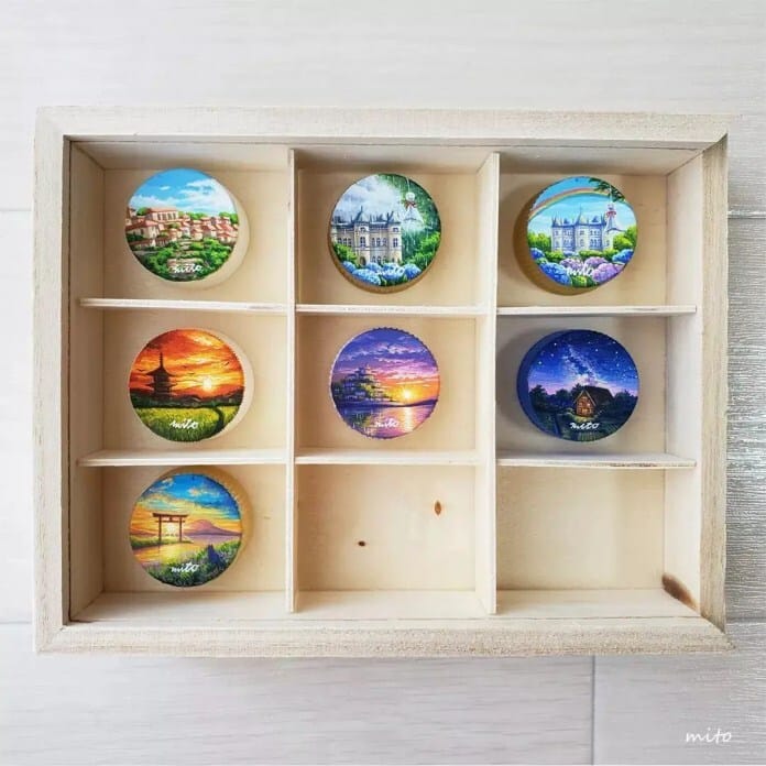 La artista japonesa Mito Nishikura recicla tapas de botellas para convertirlas en pequeñas obras de arte, pintando minuciosamente en ellas detallados paisajes.