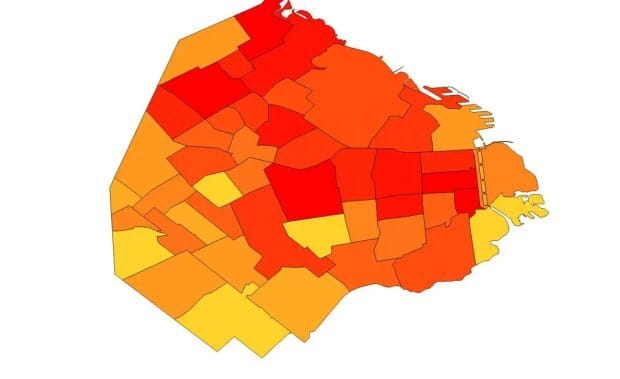 La información está distribuida por parcela y por manzana, lo que se puede observar en el siguiente mapa. Los distintos rosas-violetas señalan cuántos pisos creció cada parcela, mientras que los azules se refieren a las sumas por manzana. Cuanto más oscuro, más crecidas: