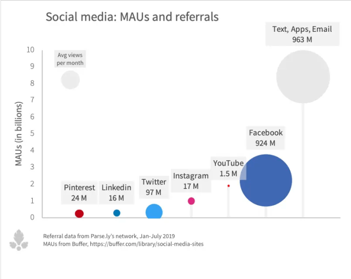 El éxito de una plataforma, en términos comerciales, a menudo se mide en usuarios activos. Comparemos el tamaño de la base de usuarios de cada plataforma en usuarios activos mensuales (MAU) con el tráfico de referencia mensual promedio que se envió a la red de Parse.ly en 2019. Esto nos dará un sentido de escala medible en el mercado de redes sociales. (Por medible nos referimos a identificable. Lo opuesto a esto es el tráfico social no identificable, o dark social)