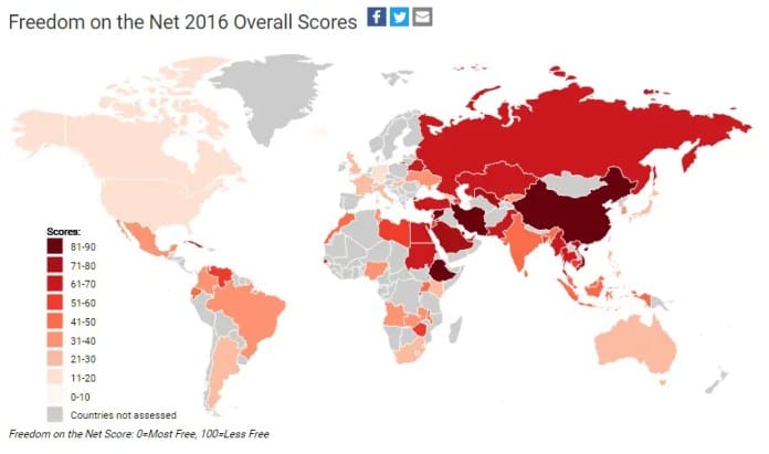 China fue el peor abusador de la libertad de Internet del año. La ofensiva del gobierno chino sobre la libertad de expresión bajo la política de «seguridad de la información» del presidente Xi Jinping está pasando factura a los activistas digitales que tradicionalmente han luchado contra la censura y la vigilancia. Decenas de acciones judiciales relacionadas con la expresión online han aumentado la autocensura, al igual que las restricciones legales introducidas en 2015. Una enmienda a la ley penal añadió penas de prisión de siete años para la difusión de rumores en redes sociales (un cargo de uso frecuente contra los que critican a las autoridades), mientras que algunos usuarios que pertenecen a grupos religiosos minoritarios fueron encarcelados simplemente para ver videos religiosos en sus teléfonos móviles. La revista londinense The Economist, y South China Morning Post fueron recientemente bloqueadas en China continental, así como los artículos y comentarios acerca de eventos sensibles, incluyendo una explosión química mortal en Tianjin en 2015.