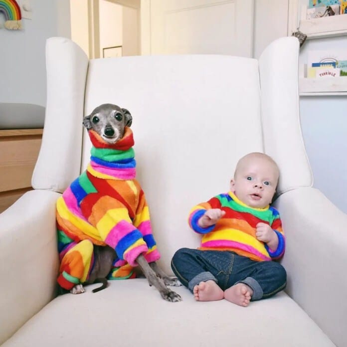 «Tenemos casi 300 prendas en su armario», dice el “padre” de la perra, Thomas Shapiro. «Tiene su propio armario, todo suyo. Es intenso. Tiene mucha más ropa que mi esposo y yo». El desarrollador web con sede en Montreal y su esposo, Louis, dieron la bienvenida a la familia a un bebé, Harry, en marzo pasado.
