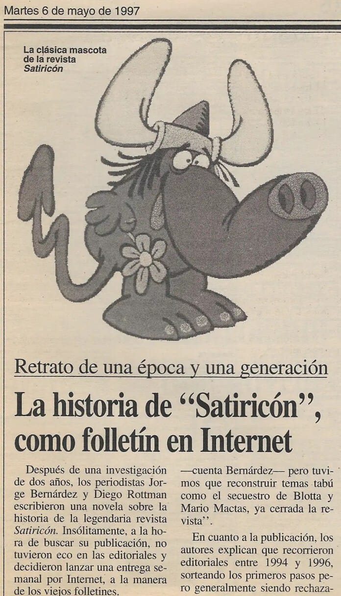 Lo que empezó como proyecto de libro periodístico, con más de 30 entrevistas y dos años de investigación, terminó como una novelización de los hechos publicada en Internet a modo de folletín. Corría el año ’97 y quien esto escribe junto con Jorge Bernárdez, cansados de recibir rechazos de las editoriales, decidimos subirlo a la naciente web, a razón de un capítulo por semana.