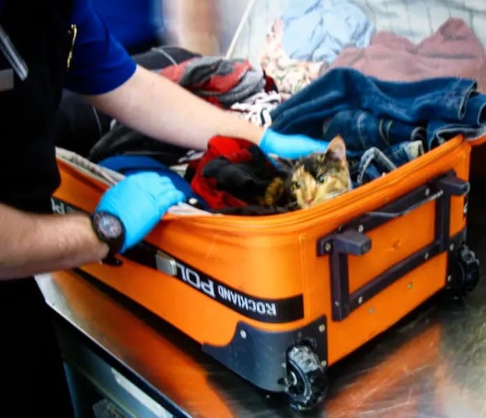 Si los animales están registrados en TSA, pueden volar con sus dueños. De lo contrario, pueden almacenarse adecuadamente en el sector de carga del avión con los otros animales. Pero en este caso, el gato Slim fue descubierto en una maleta, y fue entregado de inmediato a la Sociedad Protectora de Animales local.