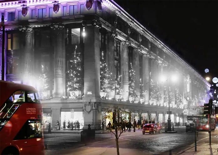 Los grandes almacenes Selfridges se iluminan con adornos navideños el 6 de diciembre de 1935 en Londres