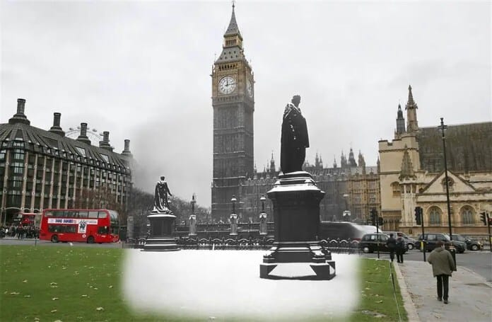 La estatua de Lord Beaconsfield se encuentra frente a las Casas del Parlamento y el Big Ben, en Parliament Square, el 24 de diciembre de 1938