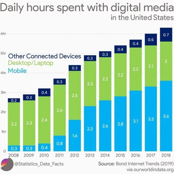 Los estadounidenses están pasando una cantidad de tiempo casi obsesiva con los medios digitales, según el Informe Anual de Tendencias de Internet de la consultora Bond Capital. En 2018, los consumidores registraron 6,3 horas al día online, un 7% más que el año anterior. La mayor parte de ese crecimiento proviene de dispositivos móviles y otros dispositivos conectados, a medida que disminuye el tiempo dedicado a las computadoras de escritorio.