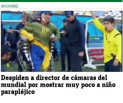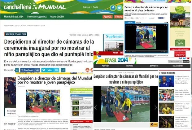 Empezó a correr el rumor por internet y la mayoría de los medios de comunicación levantaron la falsa noticia. O ningún periodista prestó mucha atención a la fiesta inaugural del Mundial o se trató de la transmisión de algunas cadenas en particular que aprovecharon para ir a tanda publicitaria en el momento en que una persona cuadripléjica pegaba el puntapié inicial ayudada por un exoesqueleto controlado con el cerebro. Lo cierto es que la queja de muchos televidentes resultó en rimbombantes títulos sobre el supuesto despido del director de cámaras del Mundial de la FIFA.
