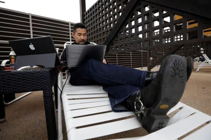 “Me encanta trabajar al aire libre. Este es un buen plan y se siente genial”, dijo Tatsuki Yamamoto, de 47 años, presidente de una firma de soluciones de TI FLEQ, sentado en una silla de piscina blanca con su computadora portátil. Los empleados de su empresa también están trabajando de forma remota, dijo Yamamoto.