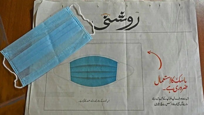 El periódico urdu “Roshni”, de Cachemira, India, adjuntó una máscara facial en la portada en su edición del martes pasado, con un texto que rezaba: «Máscara ka istemal zaroori hai» (es importante usar una máscara) junto a una flecha apuntando el texto al envoltorio conteniendo un barbijo gratuito para los lectores.