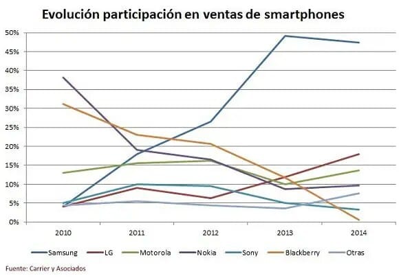 La smartphones se han convertido en una tendencia que se expande y sus modelos se han estandarizado y tampoco se diferencian demasiado en su sistema operativo, por lo tanto la posición de las marcas dentro del mercado es vertiginosa. Los dispositivos de Samsung y Iphone, una de las más costosas, son los preferidos de los clientes argentinos. Justamente, la empresa que tuvo presencia más fuerte en el mercado con los teléfonos inteligentes fue Samsung, con un 47%. La compañía se destaca por su gran gama de modelos que se adapta a todos los gustos y bolsillos y tiene una buena relación entre el precio y la calidad del producto.