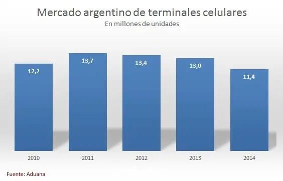 Del 2011 al 2013 las ventas de aparatos nuevos creció a causa de la creciente popularidad de los smartphones. No obstante, este escenario se modifica en el 2014 debido a la dificultad de los fabricantes para acceder a insumos importados. Esto afectó a los productores de Tierra del Fuego, de donde provienen casi el 99% de los productos comercializados en el país, que si bien son beneficiados con un régimen especial para favorecer el desarrollo industrial, también sufrieron recortes para el acceso a las divisas.