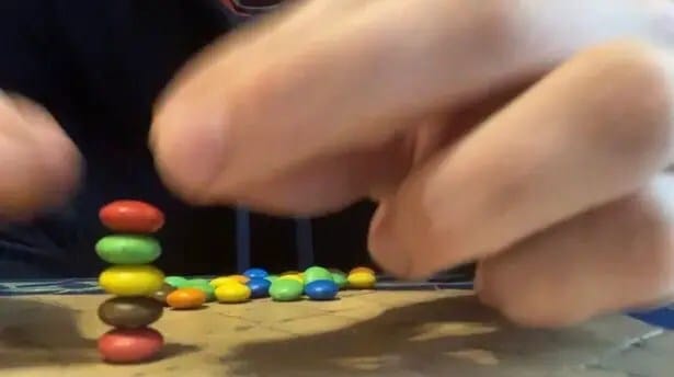 Cutbill dijo que filmó sus intentos durante dos o tres horas antes de conseguir su pila de cinco M&M’s.